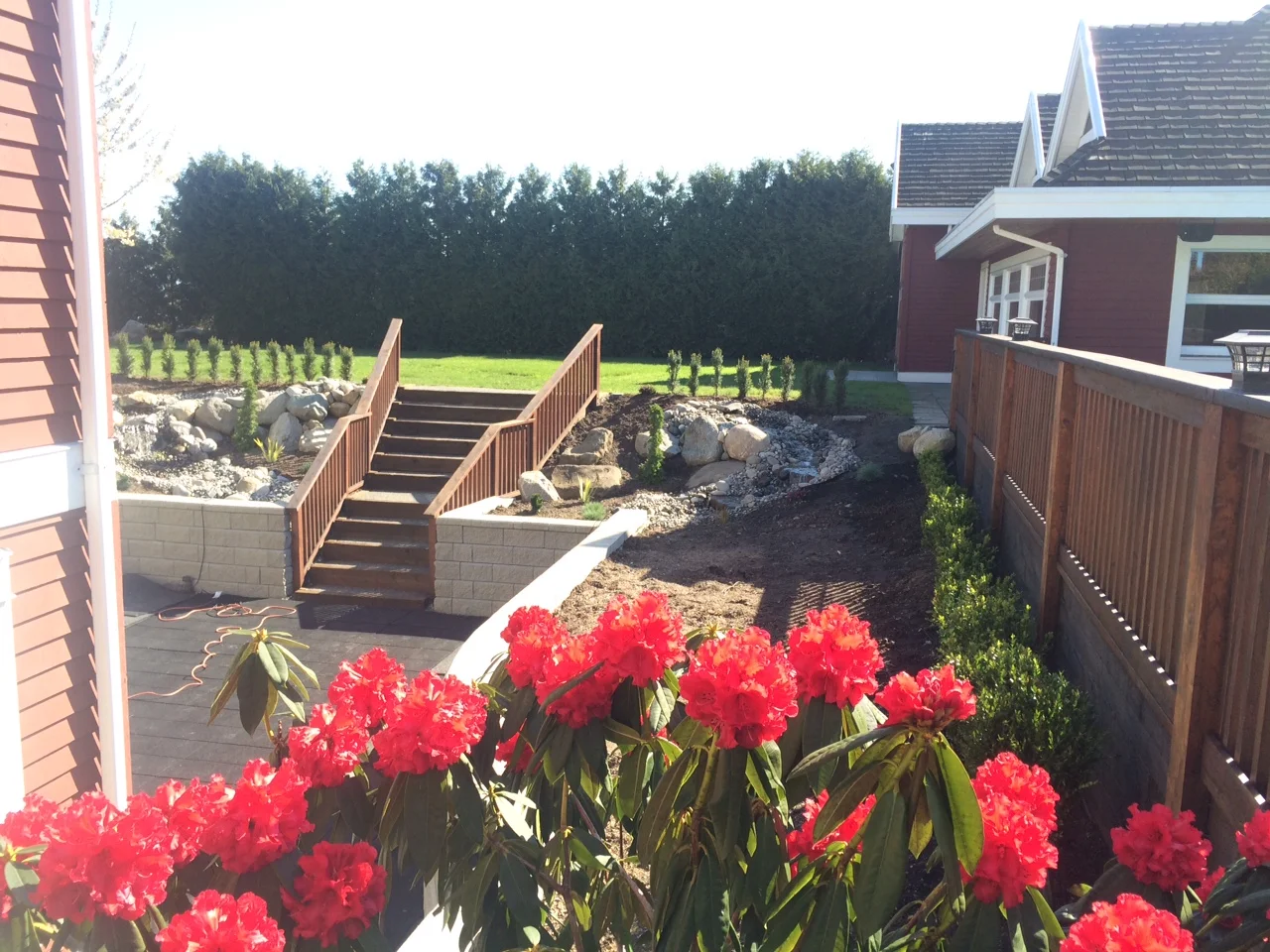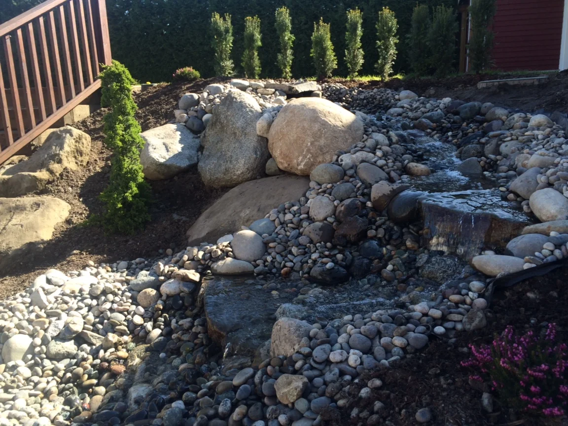 The Barkers had a set of stairs in their backyard, and they wanted pondless streams on either side. The situation was challenging because the foundation underneath was built on large boulders, and sat against a retaining wall made up of 500-1,000 lb rocks. We had to get creative with our design!